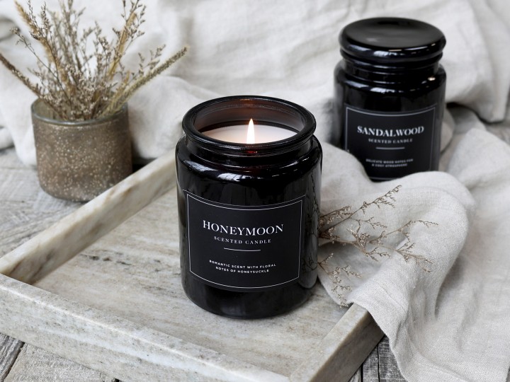 Duft lys i sort glas dette glas rummer et lyd der kan brænde i 95 timer.