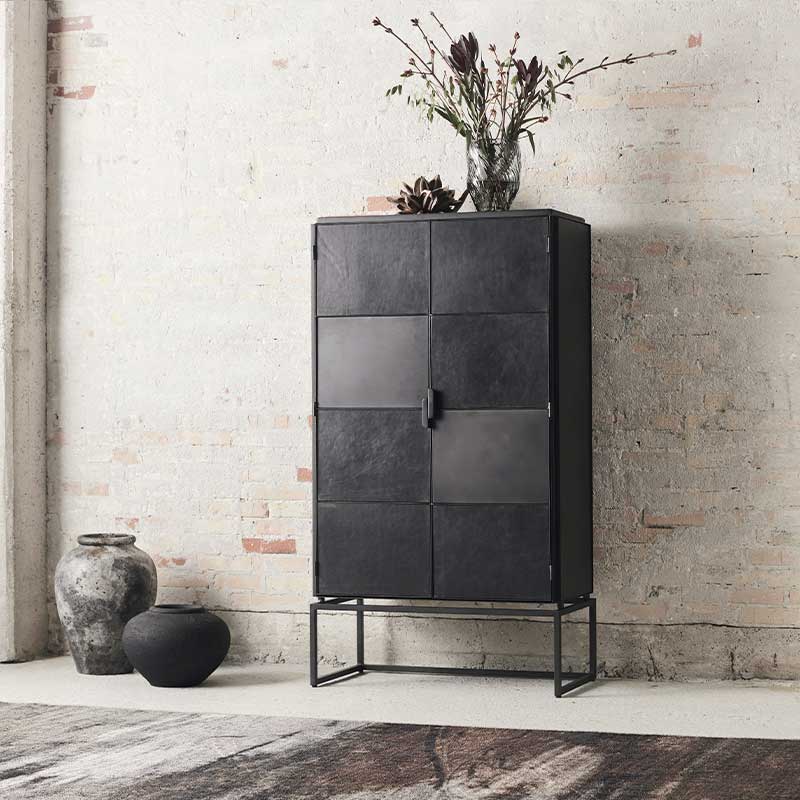 Skabet kombinerer jern og læder, hvilket giver det kant og et markant udtryk. På trods af det solide materiale fremstår designet let og elegant med rene linjer, der tilfører rummet et skulpturelt element.