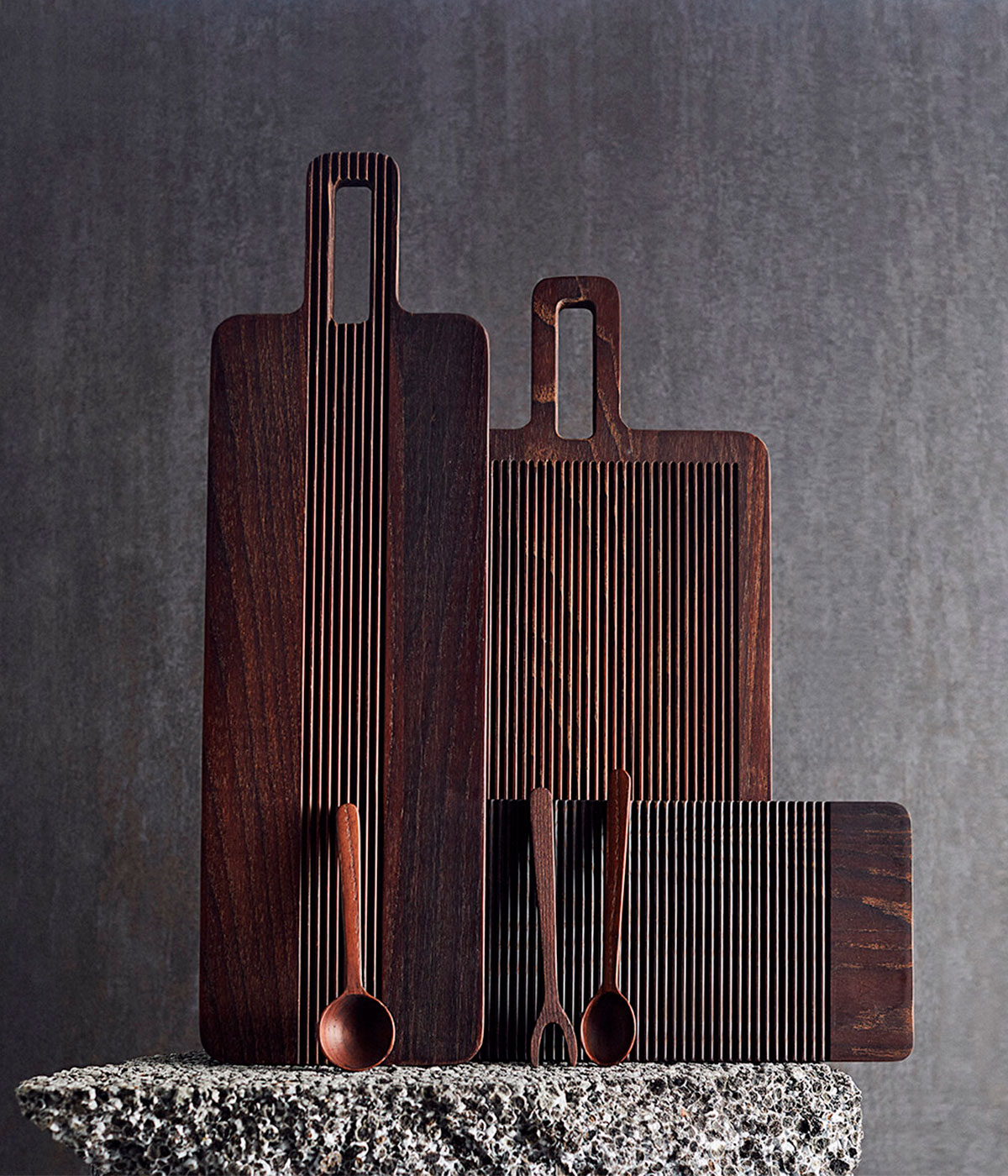 Det delikate tapassæt er en del af Yami-serien, hvis navn stammer fra det japanske ord for “mørke”. Sættet er lavet af karboniseret asketræ, hvilket giver dets karakteristiske mørke og elegante udtryk.